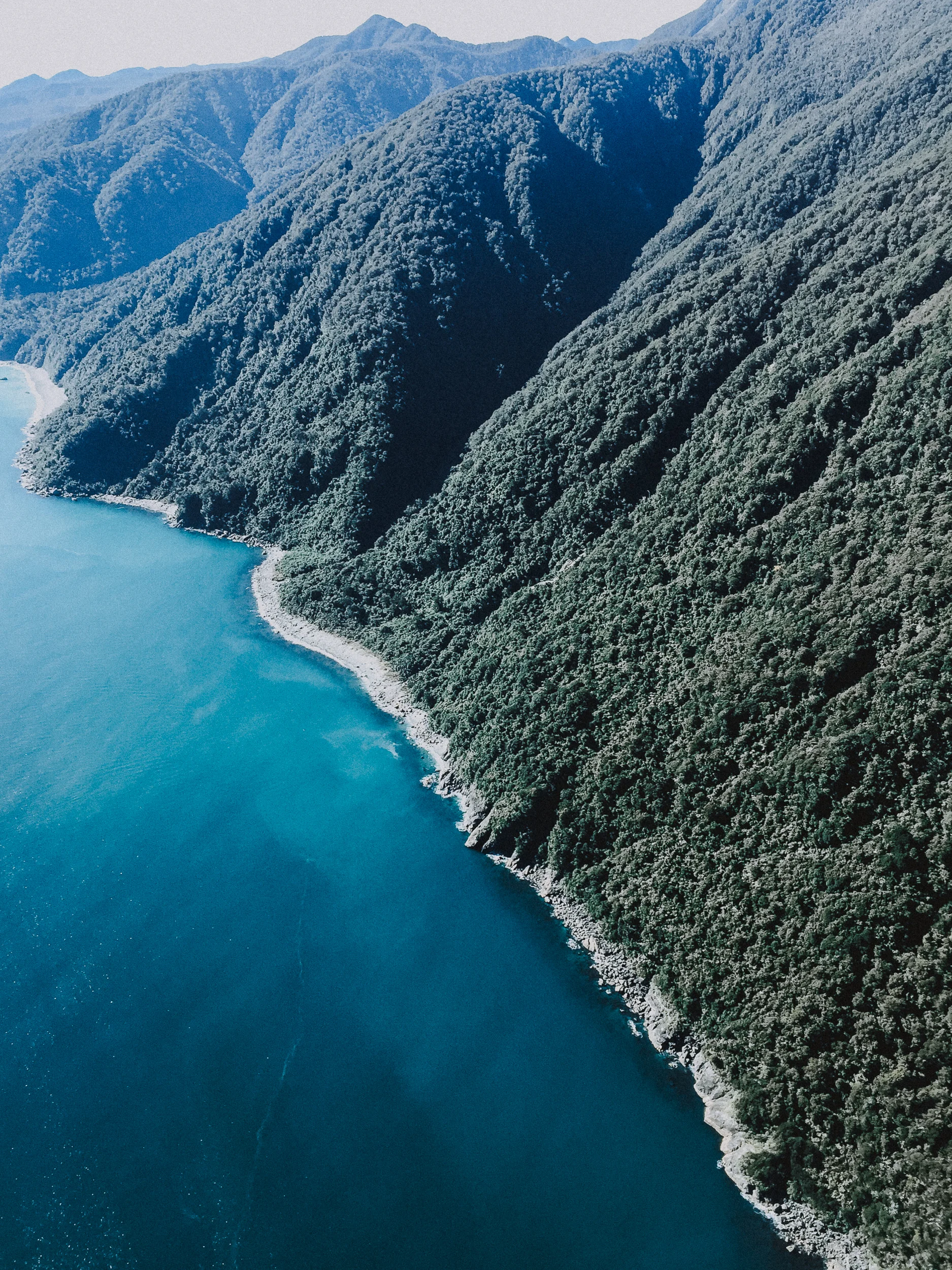 Within each part of our adventure, we encountered distinct unique climates: dry tussock covered passes, craggy glacier-capped mountains with ice blue lakes, green jungles filled with giant fern trees, glow worms, the exotic sound of the tui bird, shiny coastline with pancake stepped rocks, blow holes, and flax plants that dwarfed the trekker.